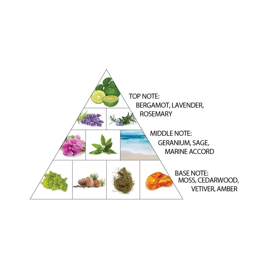 Why You'll Love It: Top notes : Lavender, Bergamot and Rosemary. Middle notes : Sea Notes, Geranium and Sage. Base notes : Amber, Vetiver, Cedar and Moss.