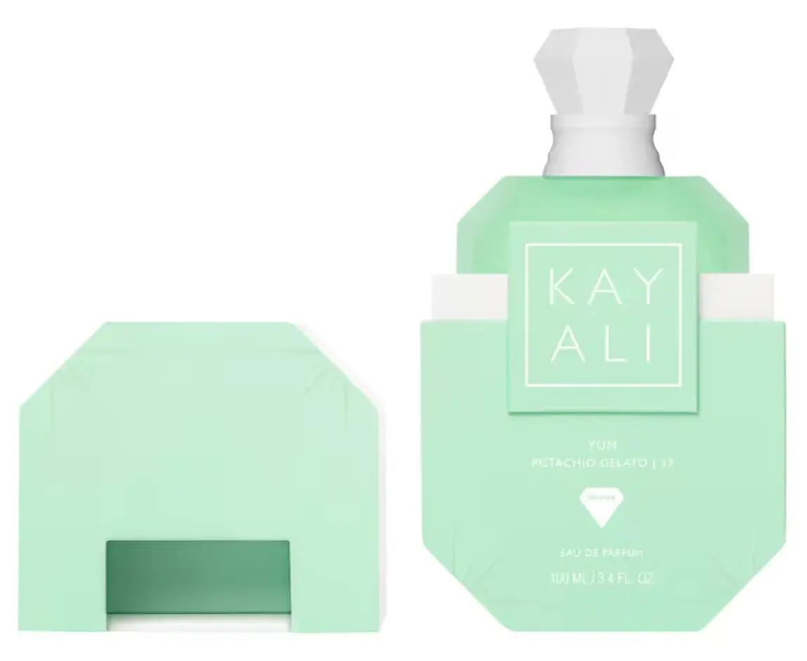 Kayali Yum Pistachio Gelato 33 Eau de Parfum Intense is a delicious explosion of irresistible and edible notes including pistachio, voluptuous whipped cream, roasted hazelnut, sweet rum, fluffy marshmallow, and fizzy cotton candy. A truly yummy fragrance that charms with an unforgettably intense, gourmand scent trail that will have you smelling good enough to eat.