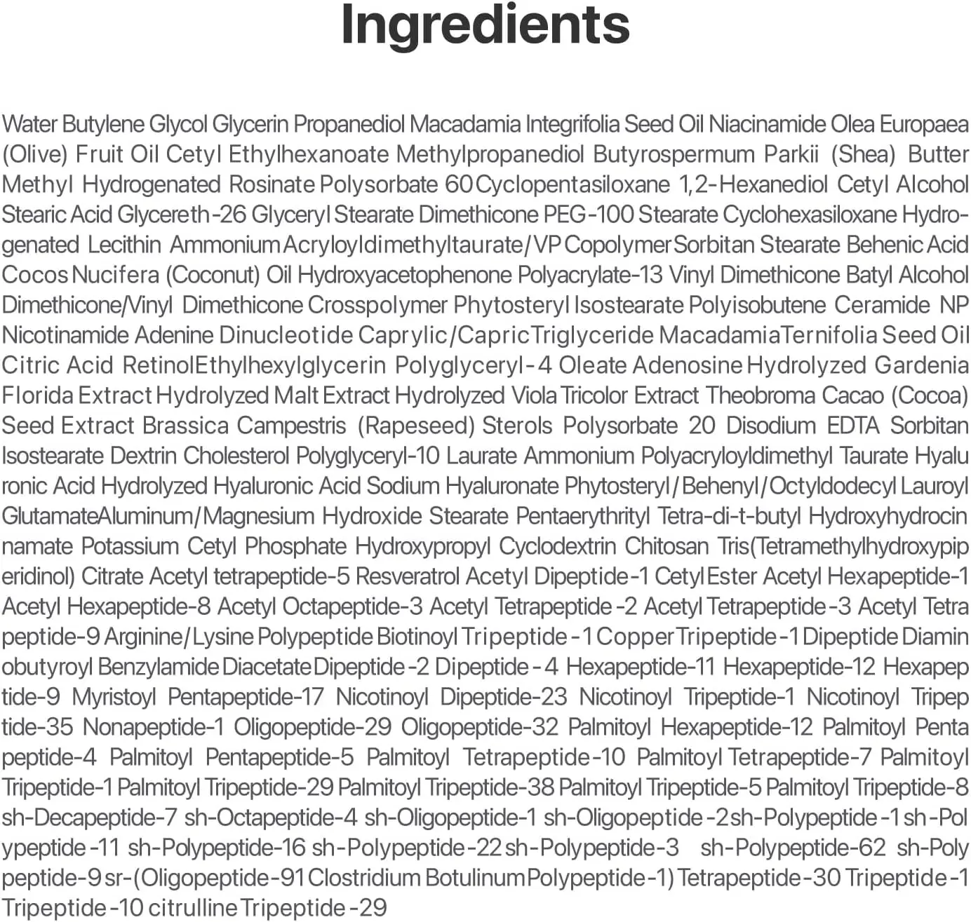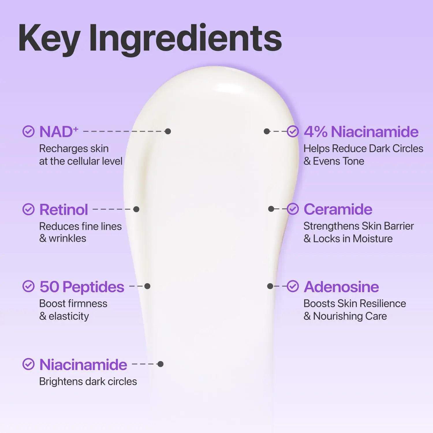 KEY INGREDIENTS Formulated with NAD+, a powerful anti-aging ingredient that supports collagen production and skin repair, along with 50 types of peptides to plump and firm the skin. Retinol smooths skin and reduces the look of wrinkles, while ceramide nourishes and strengthens the delicate eye area. Niacinamide brightens dark circles and rejuvenate the entire eye area restoring vitality and radiance.